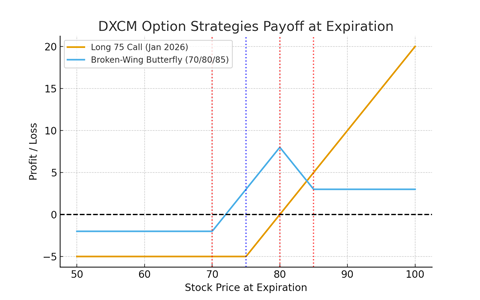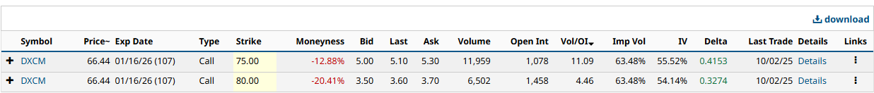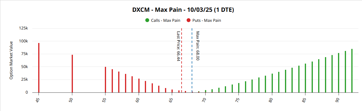 3. Skew & Max Pain Create a RangeOn the Volatility Skew chart, far OTM calls are more expensive. The market is pricing upside risk. On Max Pain, the clustering is between 68–72. That is where option sellers prefer to pin the stock at expiration. Think of it as gravity. 📊 Placeholder: Insert Screenshot 5 - DXCM Max Pain Chart ![]() How I Turn Flow Into a Trade- Validate Flow: Jan 2026 75C call buying is real. Payoff DiagramsTo make it clear, here is what the payoff looks like at expiration: - Orange line = Long Jan 2026 75 Call (unusual flow trade). Closing ThoughtsUnusual options flow is not magic. It is not always right. But it is early information. DXCM’s tape is alive right now — with big calls, amplified volatility under the gamma flip, and a max pain zone that could pull price higher. This article contains syndicated content. We have not reviewed, approved, or endorsed the content, and may receive compensation for placement of the content on this site. For more information please view the Barchart Disclosure Policy here.