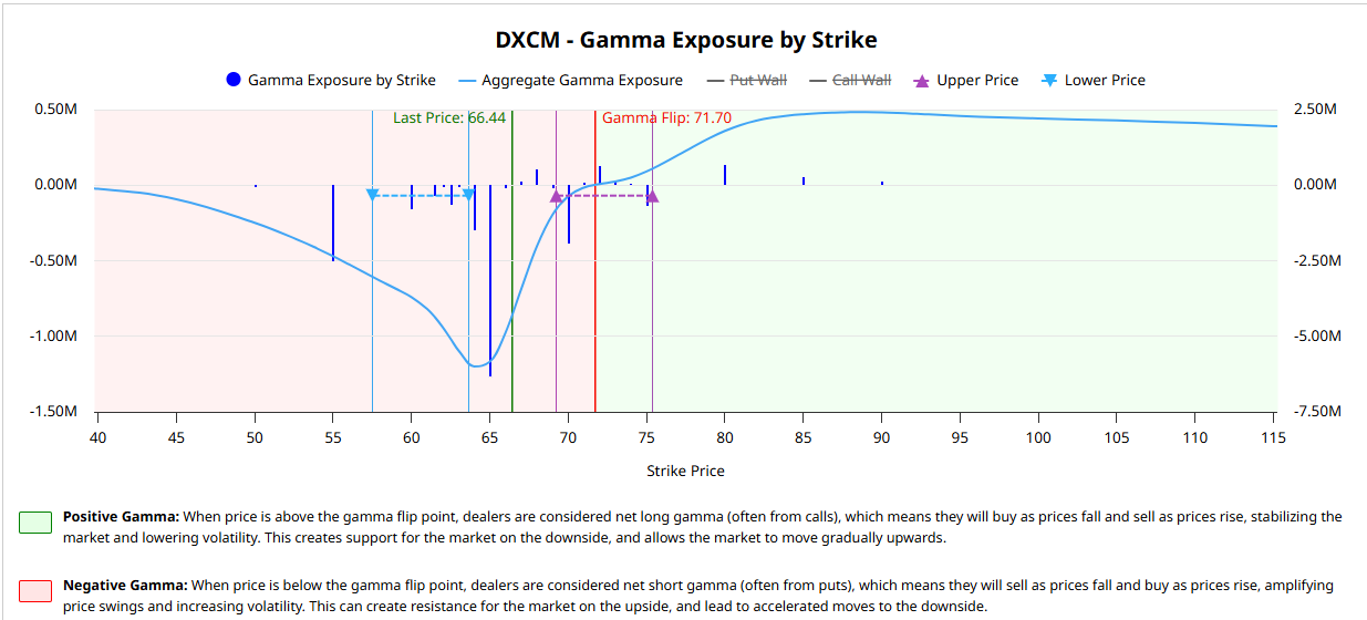 ![]() 2. Gamma Map = Volatility ZoneNext stop: Gamma Exposure. The gamma flip is ~71.70. DXCM trades below at ~66.44. Below the flip, dealers are short gamma. That means they chase price — selling into weakness, buying into strength — and that amplifies moves. ![]()